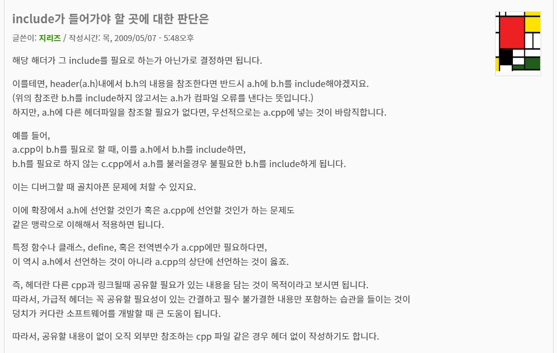 결론적으로 얘기하면, 헤더파일에 불필요한 include 문을 작성했을 경우, 다른 클래스에서 이 헤더파일을 include 할 시, 불필요한 파일까지 같이 include 하게 된다. 따라서, 헤더파일에서 꼭 필요한 파일만을 include 하고 나머지는 .cpp 파일에서 가져오는 것이 바람직하다!
