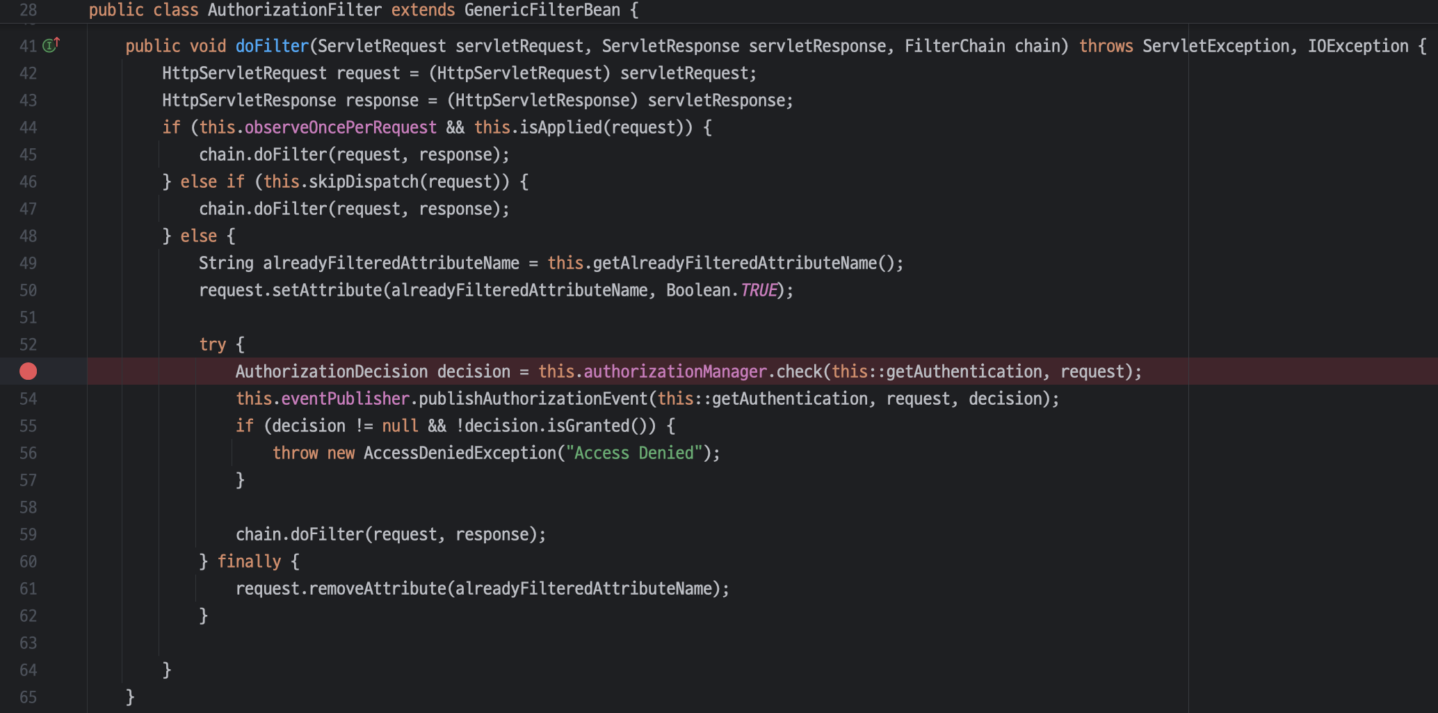 디버깅을 통해 살펴보면 AuthorizationFilter를 거치면서 인가 여부를 체크하고 AccessDeniedException이 발생하는 것을 확인할 수 있습니다: