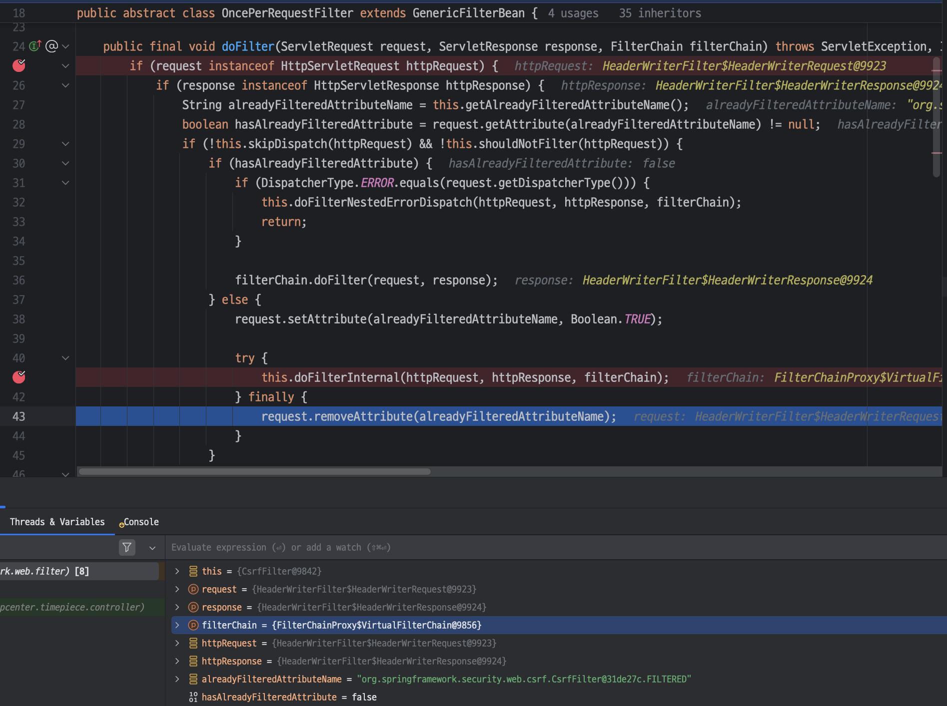 Spring Security의 필터 체인 호출과 관련된 doFilter()와 doFilterInternal() 메서드에 브레이크포인트를 설정하고 디버깅을 계속 진행했습니다.
