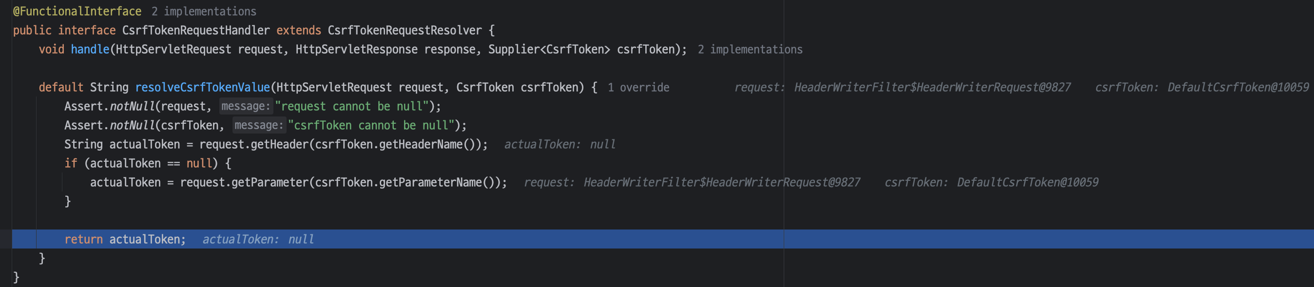 String actualToken = this.requestHandler.resolveCsrfTokenValue(request, csrfToken);