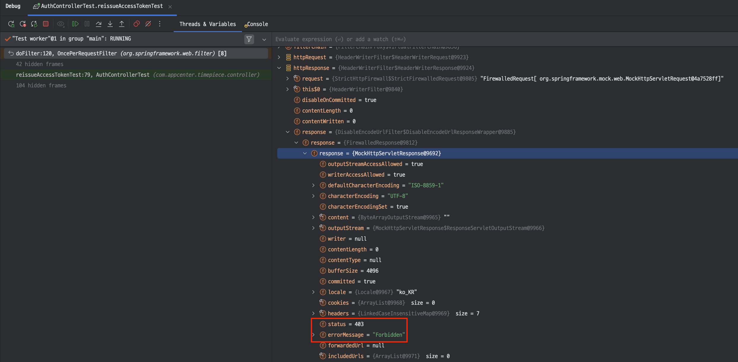 response 객체를 확인해보면 "403 Forbidden" 상태 코드가 설정되어 있는 것을 볼 수 있습니다.
