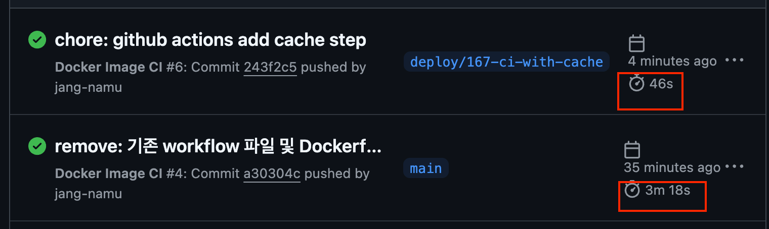 캐싱 적용 후 워크플로우 실행 시간을 비교해보면 큰 차이가 나타납니다